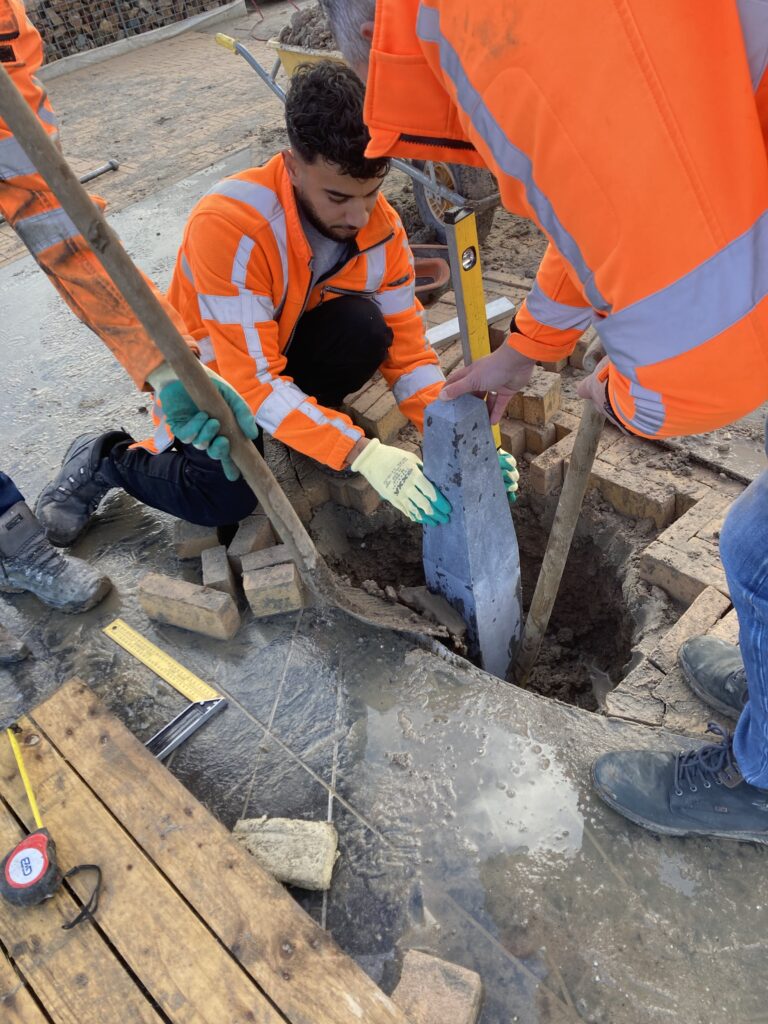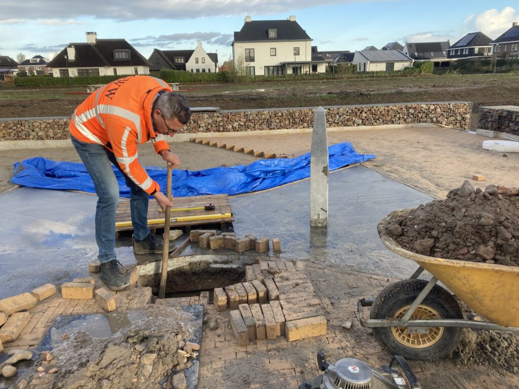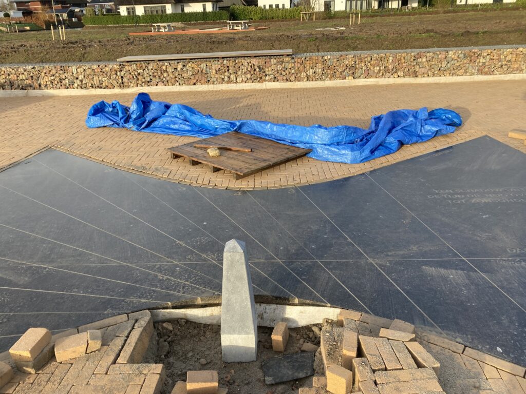 De bestrating is grotendeels klaar, er moeten nieuwe stenen geleverd worden, maar de schaduwwerper kan geplaatst worden. Ook dit komt weer heel precies. Bij het uitgraven van het gat, blijkt het grondwater zo hoog te staan dat het onderste gedeelte van de schaduwwerper in het water staat. Dat betekent dat hij zich de eerstkomende tijd moet gaan ‘zetten’. De bestrating kan rondom de schaduwwerper voorlopig helaas niet verder afgewerkt worden. Met als gevolg dat het nog even duurt voordat de zonnewijzer echt af is.