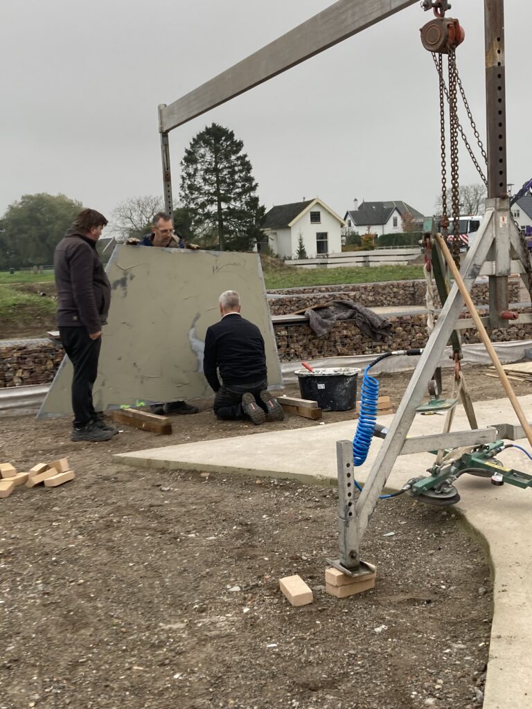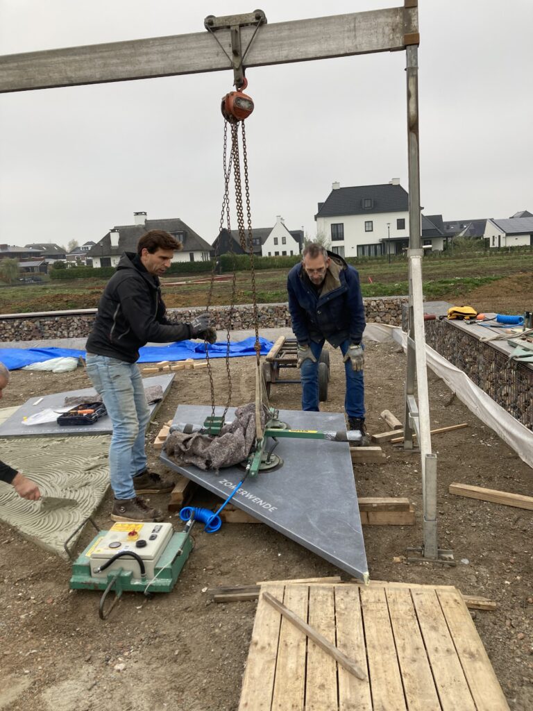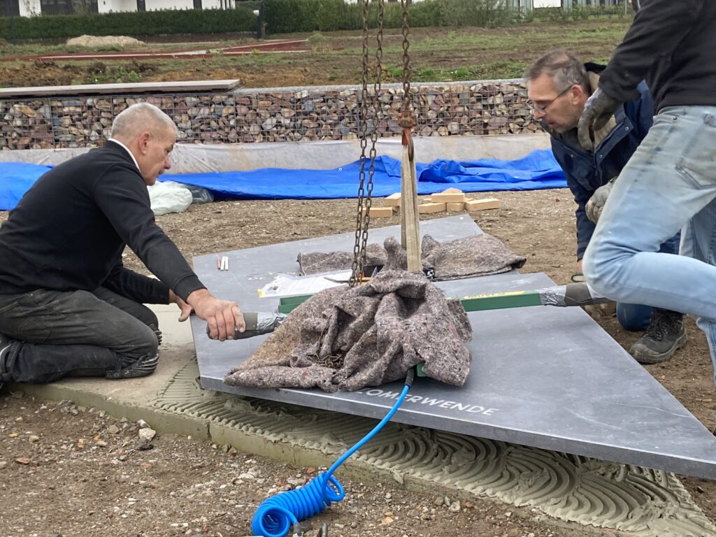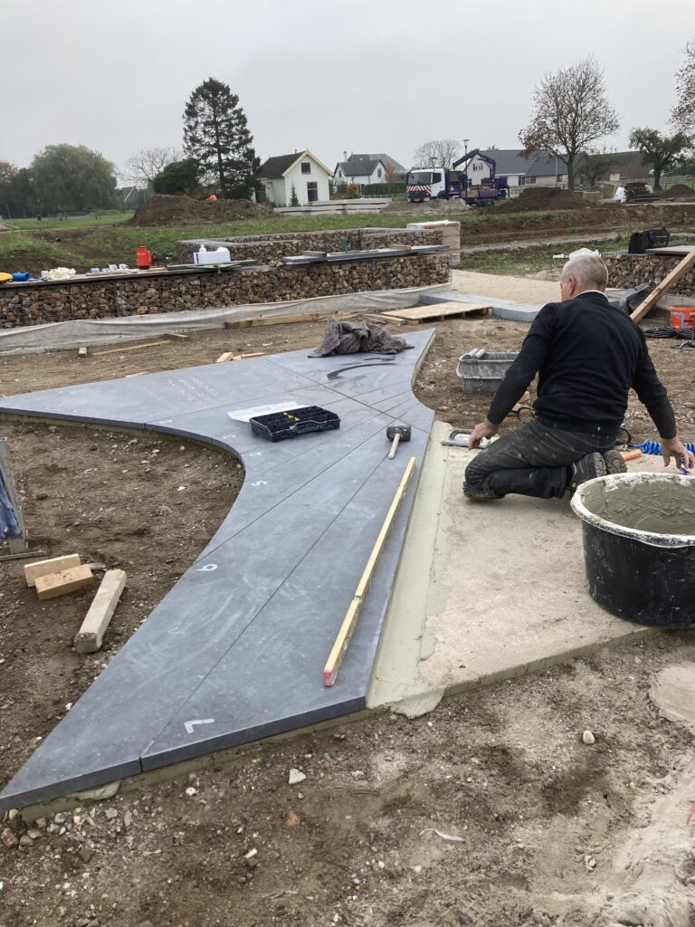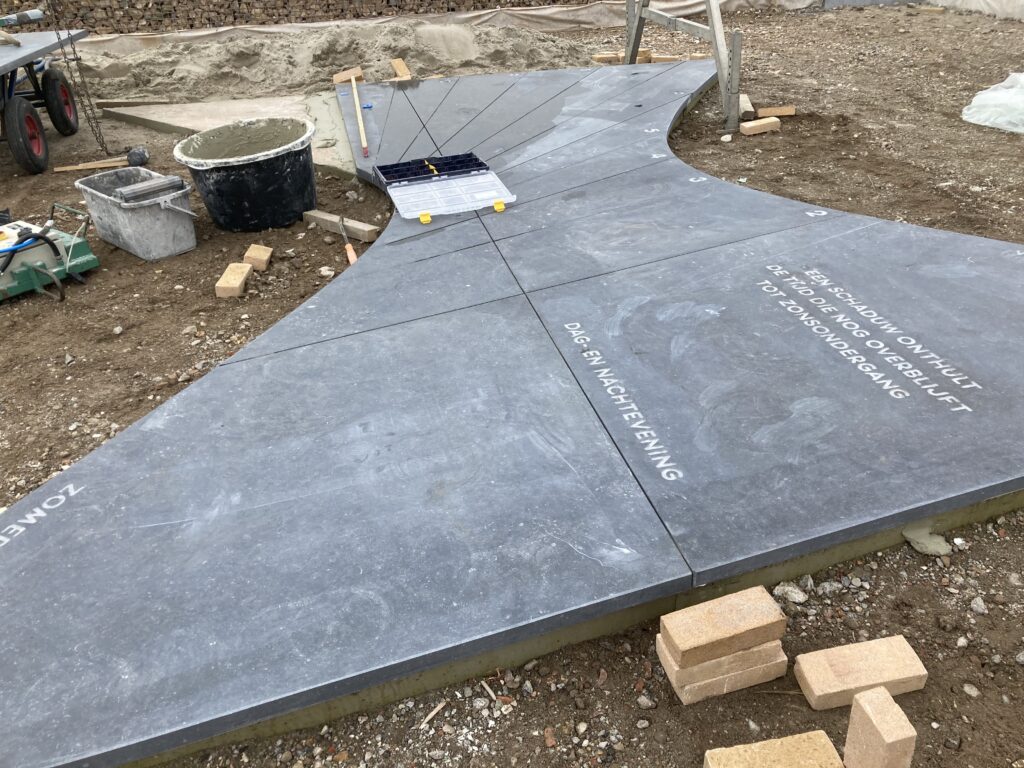 Helaas werkte het weer de laatste tijd niet mee, maar eindelijk is het nu zover. De zonnewijzer kan geplaatst worden. Met veel zorg en precisie worden de hardstenen platen verlijmd en op hun plek geschoven.