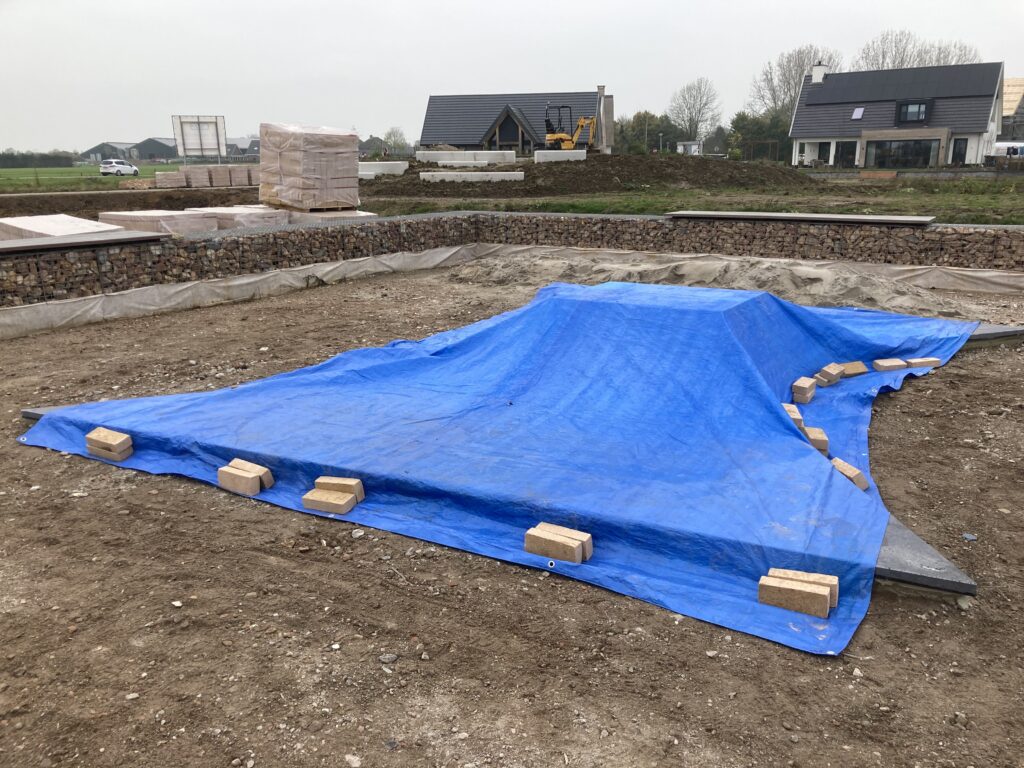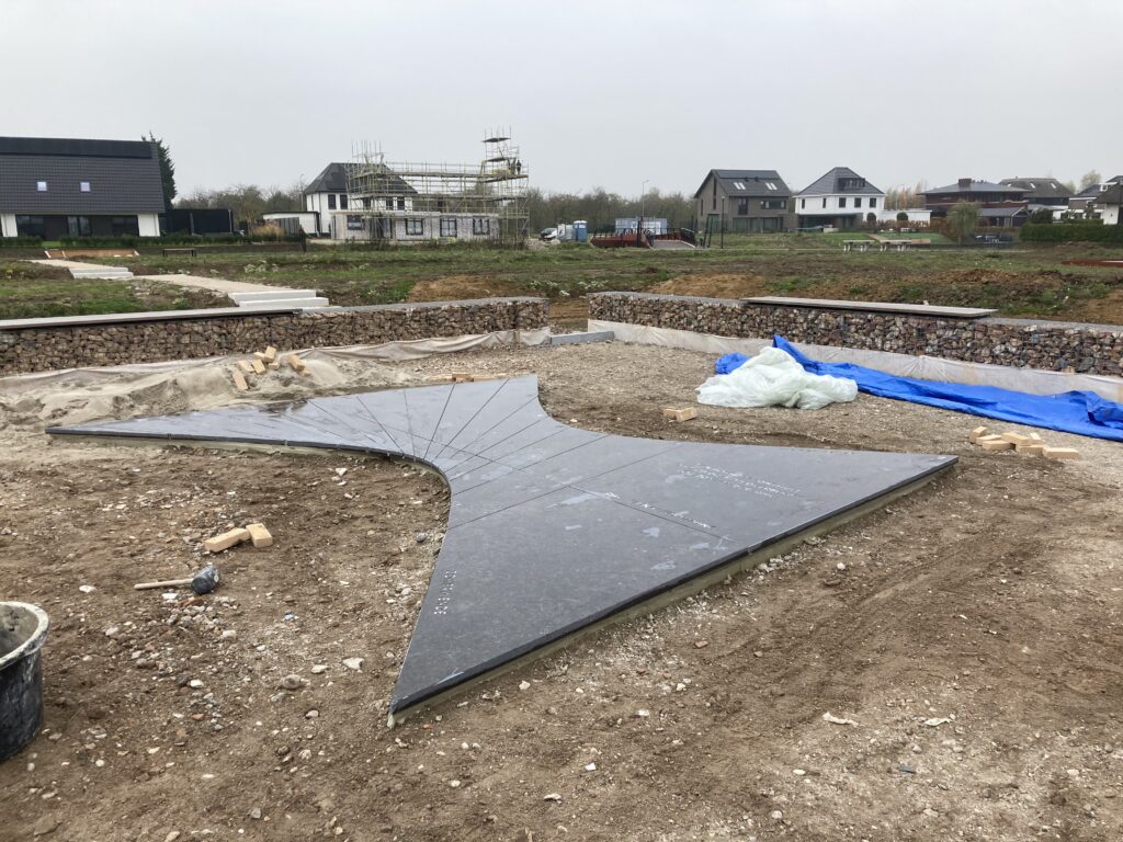 Nadat alles keurig gevoegd en schoongemaakt is, wordt de zonnewijzer afgedekt om te drogen. Nu alleen de schaduwwerper nog plaatsen zodra men met de bestrating begint.