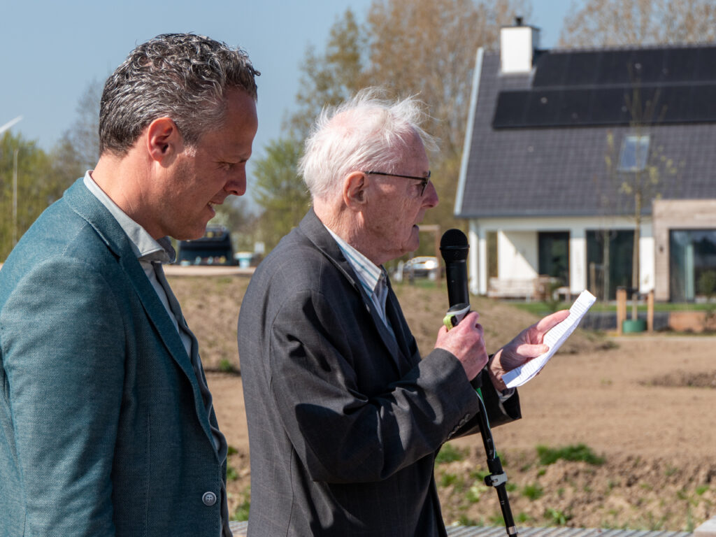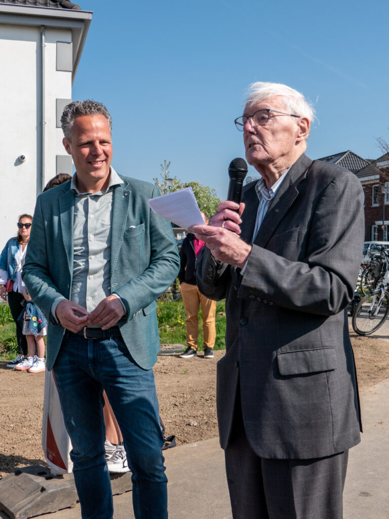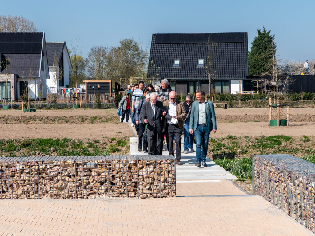 Wethouder van Stappershoef knipte het lint door en gaf daarna het woord aan Willy Leenders, de ontwerper van de zonnewijzer. Deze bedankte de gemeente West Betuwe en alle anderen die meegewerkt hadden aan de realisatie van de zonnewijzer voor hun inzet om zoiets unieks te kunnen realiseren. Daarna gingen we in stoet richting de oude fundamenten van het Huys te Meteren waar binnen de zonnewijzer is geplaatst.